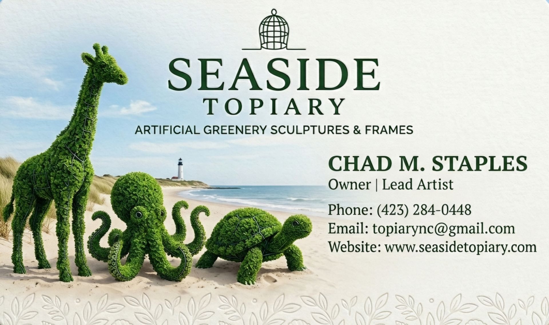The company specializes in building large-scale topiary sculptures using steel and rebar armatures wrapped in artificial boxwood greenery. The approach allows the structures to maintain their shape year-round while withstanding coastal weather conditions common along the North Carolina shoreline.